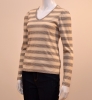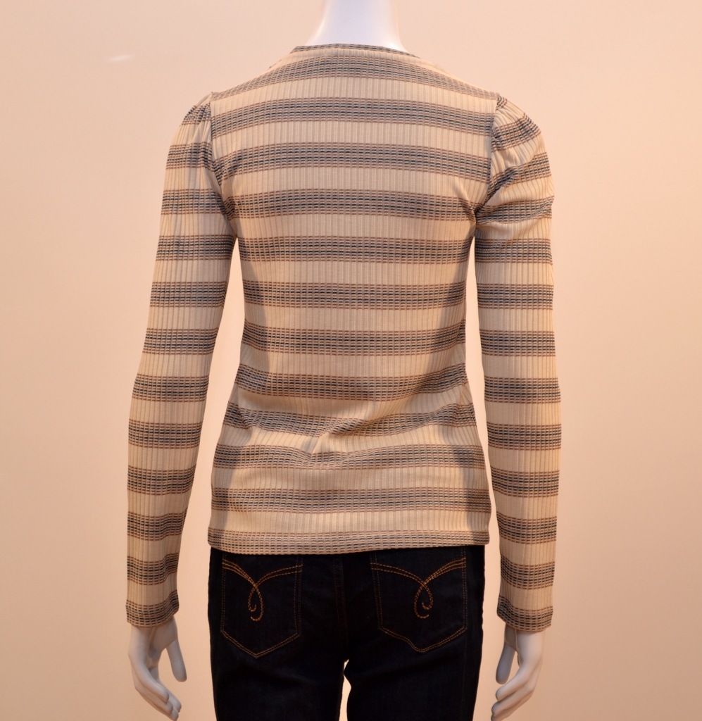 Une jolie petite prièce facile à glisser sous vos différentes vestes. Ce tee shirt comporte une encolure en V soulignée par une bordure unie à côtes plates, quelques fronces aux épaules, des manches longues et une base droite. Il présente une coupe régular. Il est confectionné sur un support fluide côtelé avec jeux de rayures.