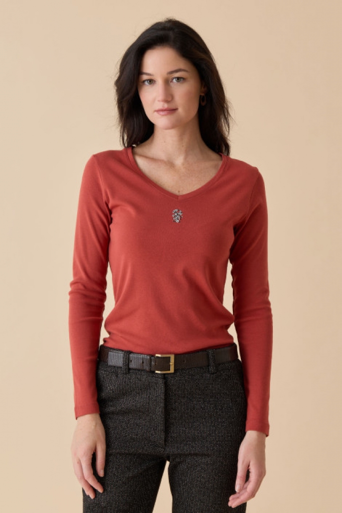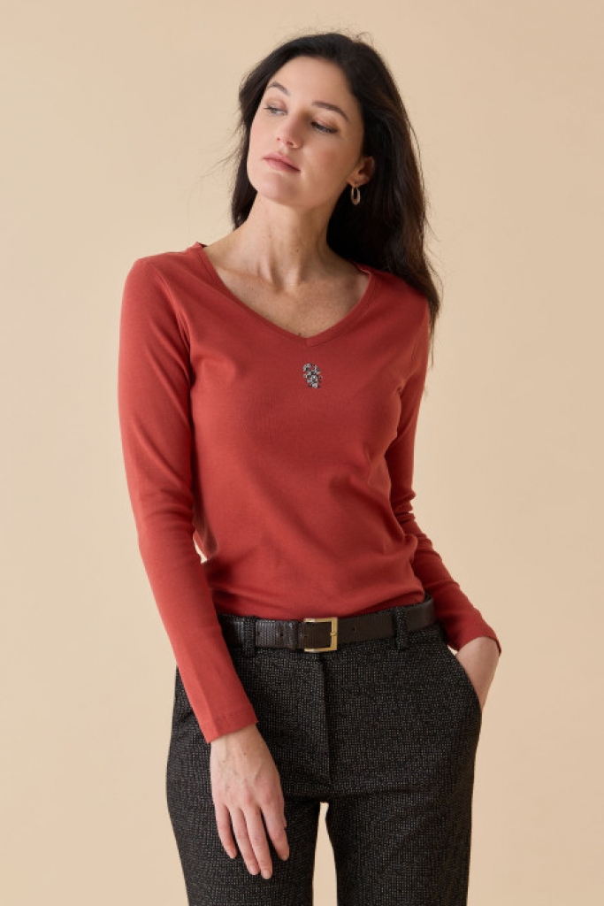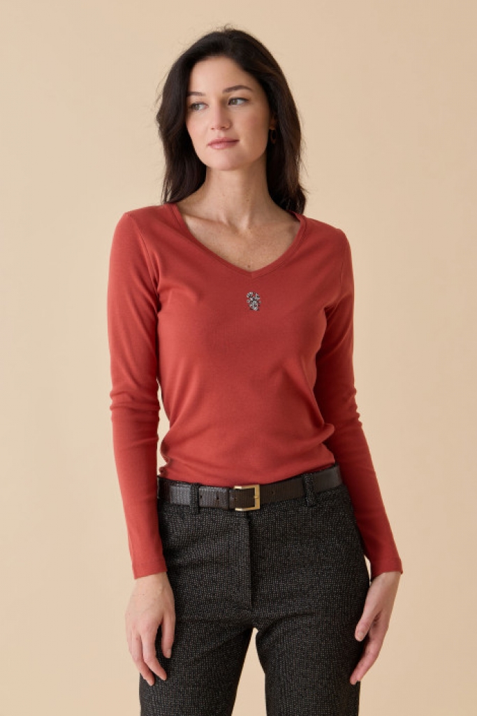 Le fantaisie : le t-shirt uni en côte 1x1 coton, col V coeur, manches longues, fish "CIRCUS" print avec relief et strass.