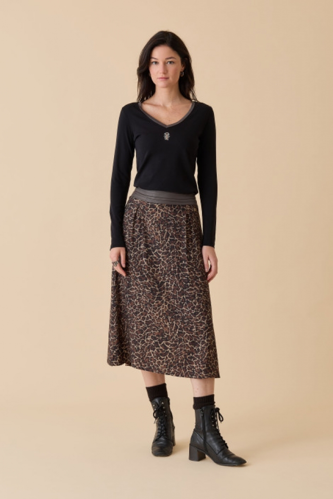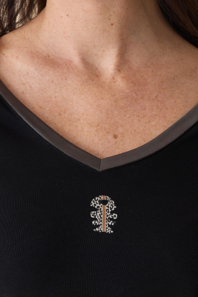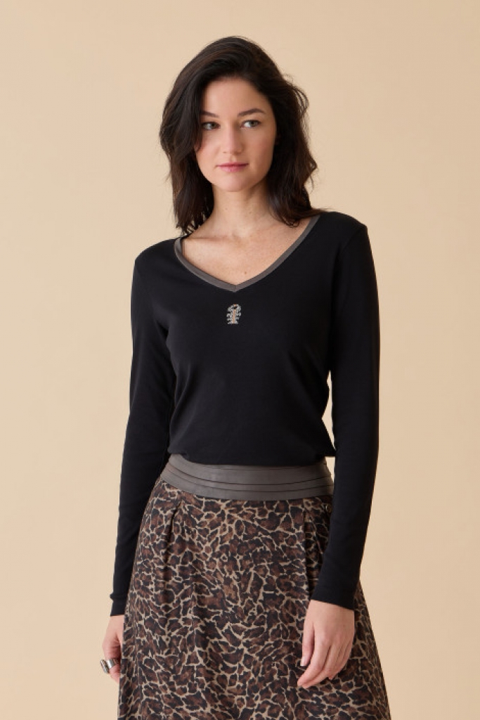 Le fantaisie : le modèle uni en côte 1x1 coton, col V en maille irisée bronze, manches longues, fish "LEOPARD" en print léopard et or.