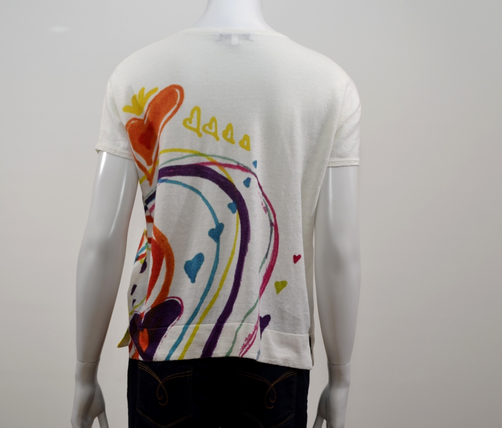 Magnifique produit en lin aux couleurs acidulées. Ce tee-shirt comporte une encolure ronde soulignée par une garniture côtelée, des manches courtes sur des emmanchures chauve-souris et une large empiècement côtelé à la base vous assurant ainsi une parfaite tenue. Ce modèle présente une coupe loose. Il est confectionné sur un suport lin/coton très agréable à porter et propose des visuels abstraits parsemés de coeurs.