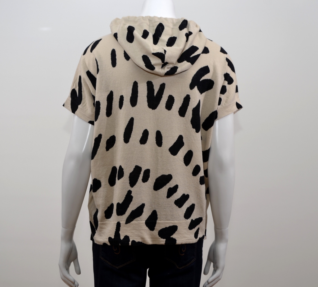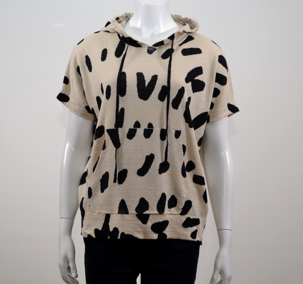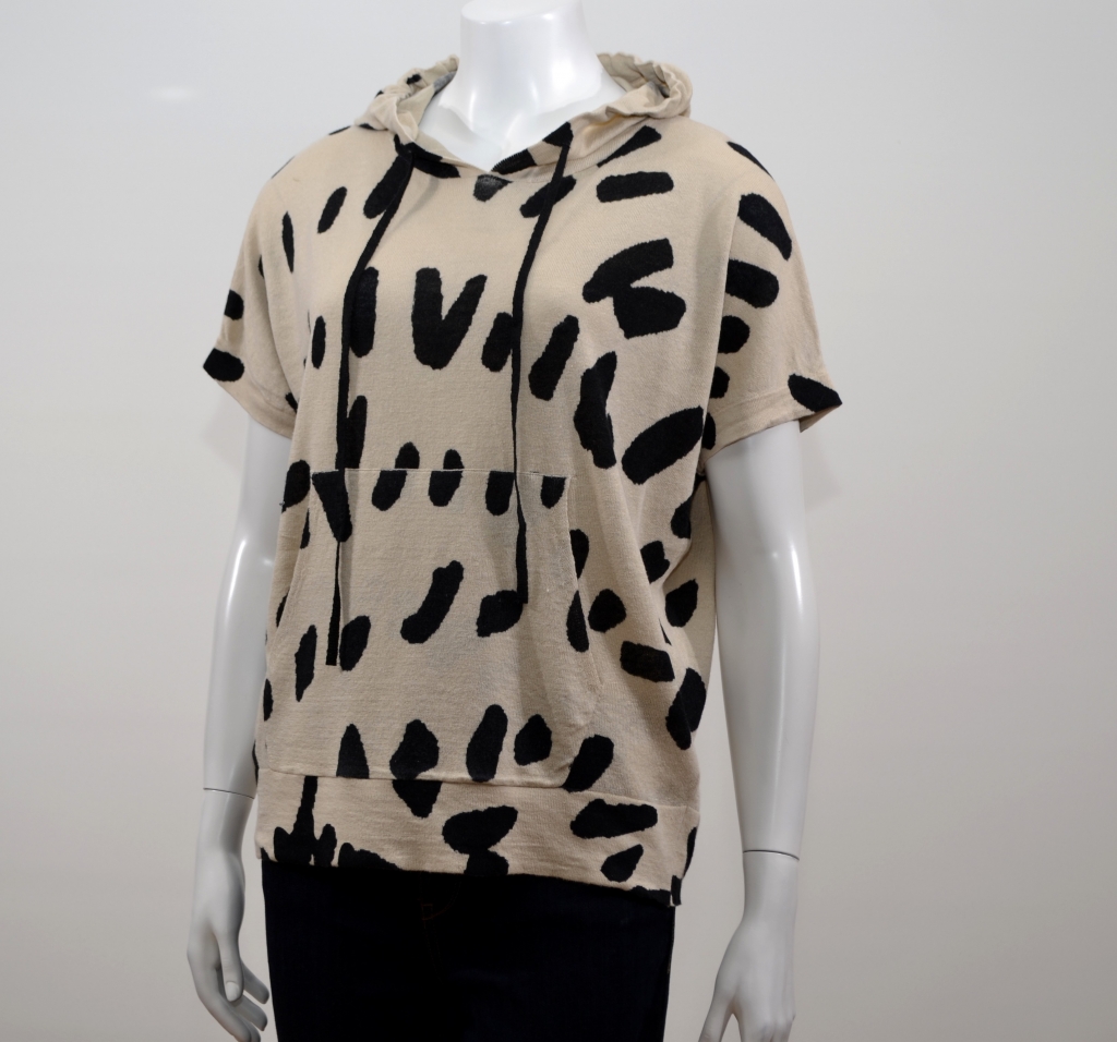 Joli modèle visuel aux inspirations animalières. Ce tee-shirt comporte une encolure ronde complétée par une capuche non amovible avec bordure côtelée coulissable par cordon sous tunnel, des manches courtes style chauve-souris, une poche kangourou et une base droite terminée par un large empiècement côtelé vous assurant ainsi une parfaite tenue. Ce modèle présente une coupe oversize. Il est confectionné sur un support lin/coton très agréable en périodes de fortes chaleurs.