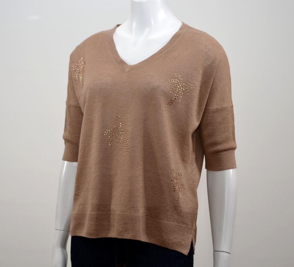 Joli modèle en lin affichant des visuels palmiers en brillants. Ce tee-shirt comporte une belle encoliure flatteuse en V, des manches courtes côtelées sur des emmachures droites et un large empiècement côtelée à la base vous assurant ainsi une parfaite tenue. Ce modèle présente une coupe oversize. Il est confectionné sur un support en pur lin très agréable à porter en périodes de fortes chaleurs.