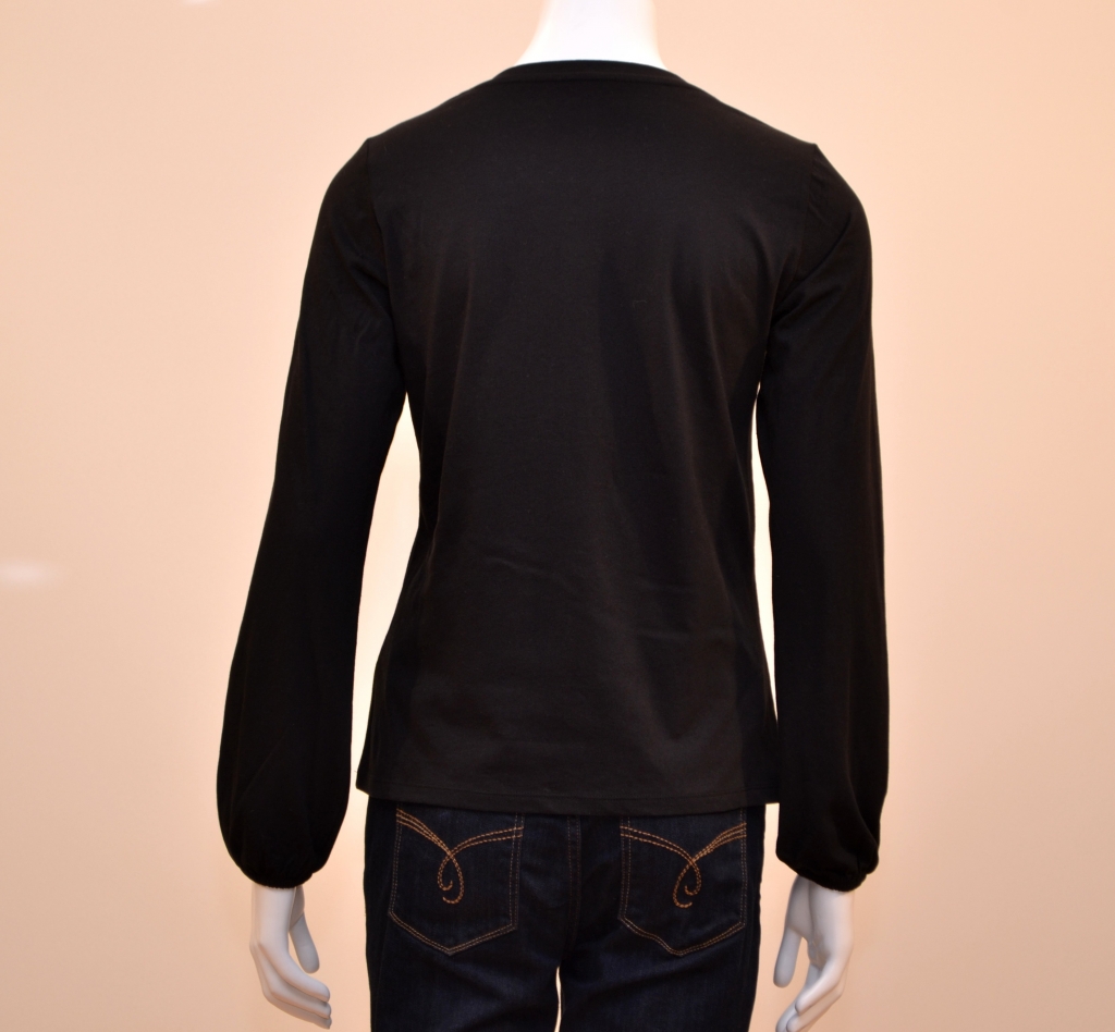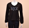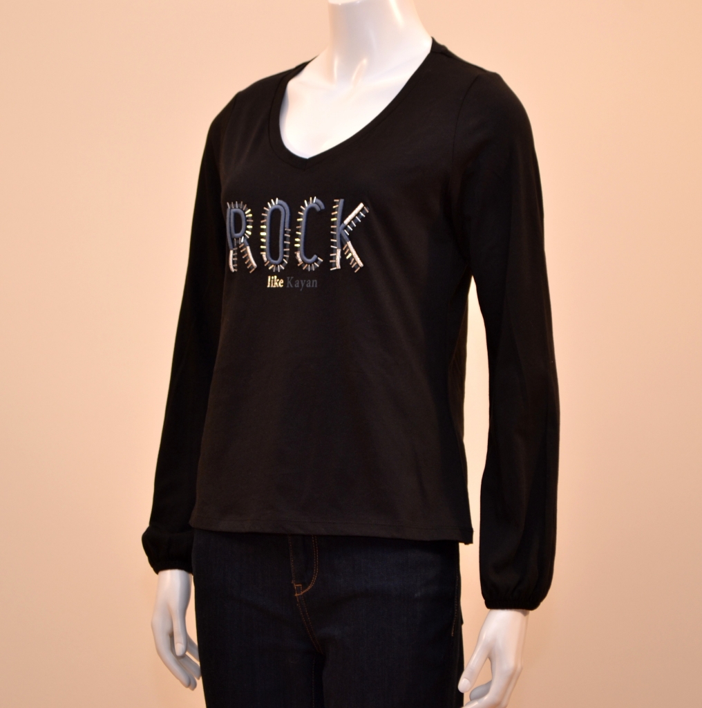 L'indispensable petite pièce noire et lookée facile à porter tout au long de cette nouvelle saison. Ce tee-shirt comporte une belle encolure en V, des manches longues et une base droite. Il présente une coupe régular. Il est confectionné sur un support en pur coton et arbore un joli logo "ROCK" mélangeant broderies, sequins et sérigraphies.