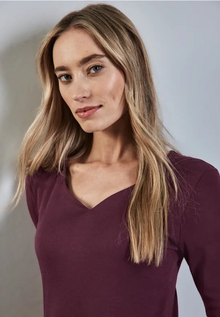 Ce tee-shirt à encolure en cœur dans la coupe ADA apporte un charme féminin à votre tenue. Le devant à double épaisseur assure l'opacité et le doux mélange coton-modal est particulièrement agréable au toucher. Les manches 3/4 complètent parfaitement le design.