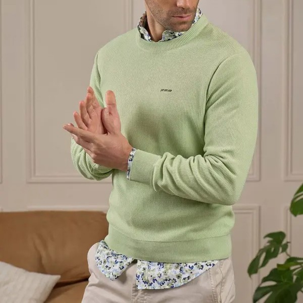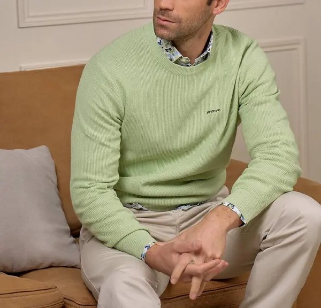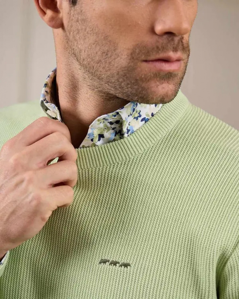 Pull signé MISE AU GREEN. Collection Printemps Eté 2026.