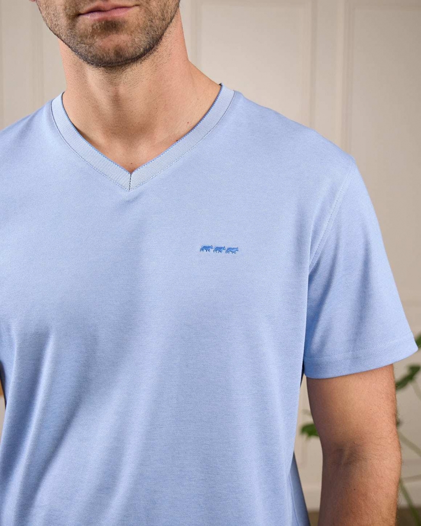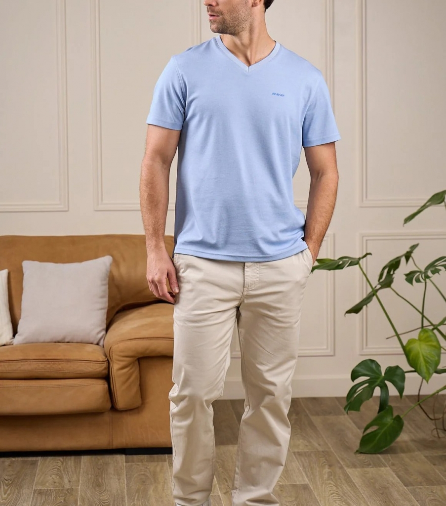 Ce tee-shirt pour homme dévoile un col V contrasté et des surpiqûres au niveau des manches et de la base. Autant de détails soignés qui font de lui un modèle basique mais plein de style ! Son plus ? Sa matière mélangée en coton issu de l'agriculture biologique et polyester qui offre un maximum d’aisance. Son coloris bleu dynamise facilement chaque tenue pour une allure chic en toute occasion.